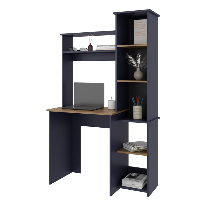 Computer Desk with Hutch and Side Bookshelf, Modern Home Office Desk with Storage Shelves, Kronos Blue and Natural Oak